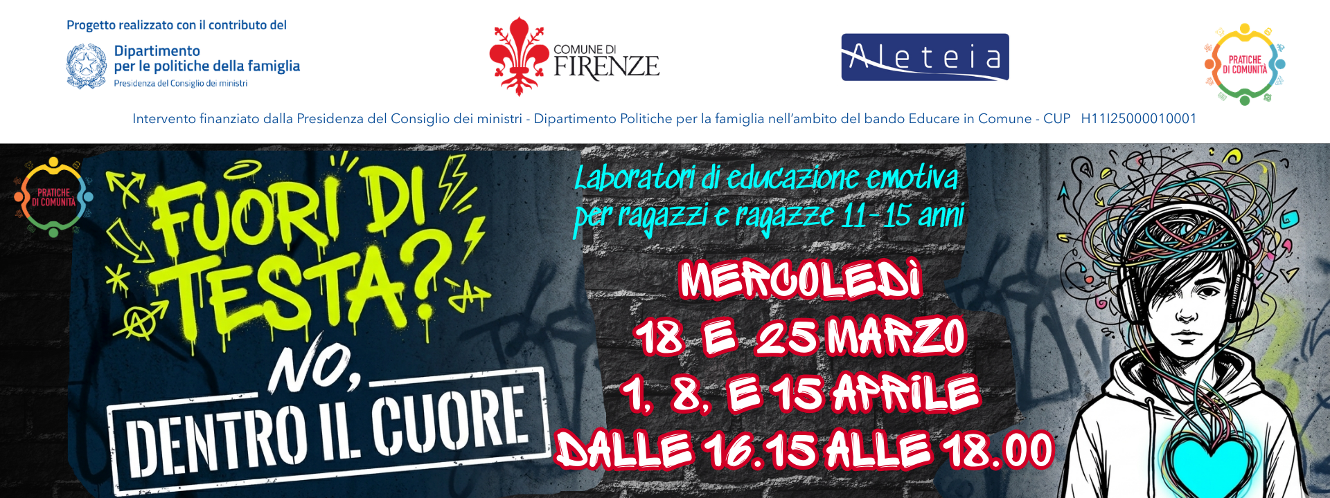 Nell’ambito del progetto "Pratiche di Comunità" - Bando Educare in Comune, il Comune di Firenze propone un percorso di laboratori di educazione emotiva rivolti a ragazzi e ragazze dagli 11 ai 15 anni, con l’obiettivo di accompagnarli nello sviluppo di competenze fondamentali per il benessere personale e relazionale.