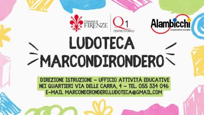 Marcondirondero Quartiere 1 0 - 3 anni 3 - 6 anni 6 - 11 anni Via delle Carra, 4 055 334046 marcondirondero.ludoteca@gmail.com Le proposte on line Programma delle attività di febbraio Programma delle attività di marzo